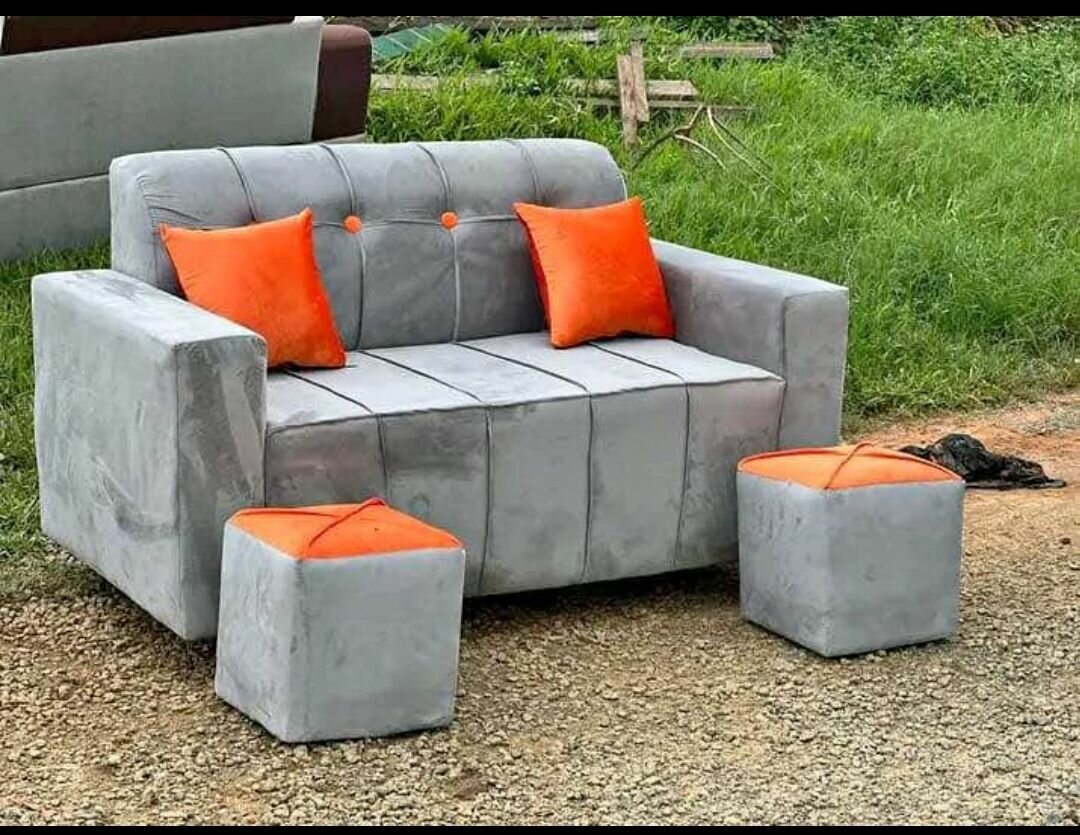 Découvrez cet ensemble élégant comprenant un canapé et deux poufs en tissu gris et orange. Parfait pour votre salon ou jardin, il offre un style moderne et confortable. Les meubles sont conçus pour un usage intérieur et extérieur.