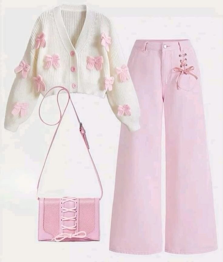 Découvrez cet ensemble girly et élégant composé d'un cardigan blanc orné de nœuds roses et d'un pantalon rose taille haute. Parfait pour une allure féminine et moderne, cet ensemble est idéal pour des sorties entre amis ou des journées décontractées. Le sac assorti ajoute une touche de sophistication. Exprimez votre style unique avec cet ensemble tendance!