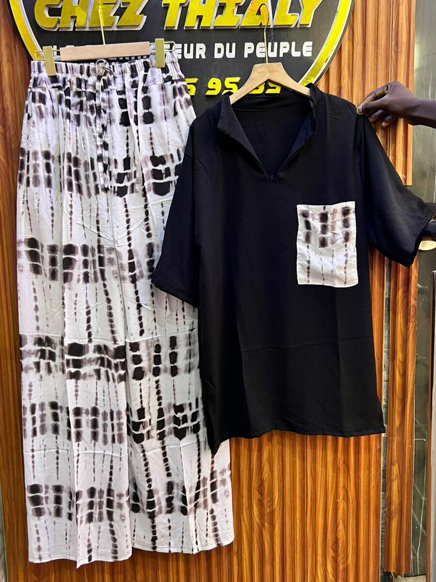 Explorez le confort et le style avec cet ensemble décontracté noir et blanc. Comprend un haut noir à manches courtes avec une poche assortie et un pantalon ample à motifs. Parfait pour les sorties décontractées ou les moments de détente chez soi. Apportez une touche artistique à votre garde-robe avec ce look unique et élégant.