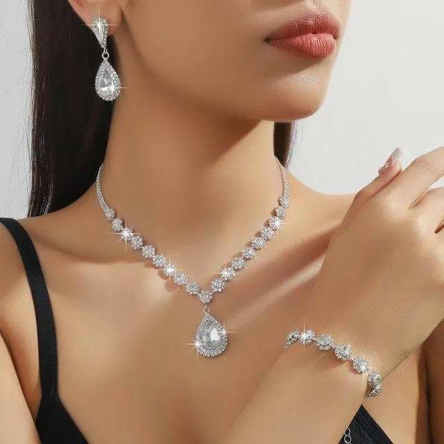 Découvrez votre ensemble composé de chaîne, boucles d'oreilles, et bracelet. Matière de conception : acier inoxydable et cristal. Elle ne noirci pas et ne déteint pas également.