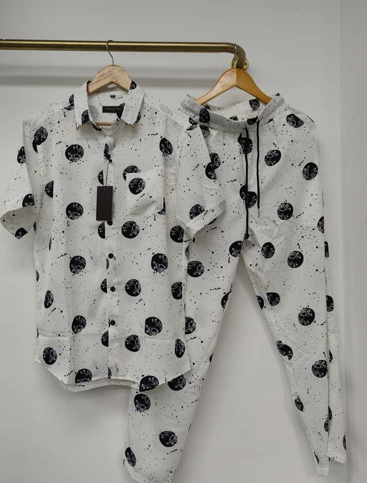 Complétez votre look avec cet ensemble élégant de chemise et pantalon à imprimé noir sur fond blanc. Parfait pour un style décontracté et tendance. Idéal pour soirées et sorties.