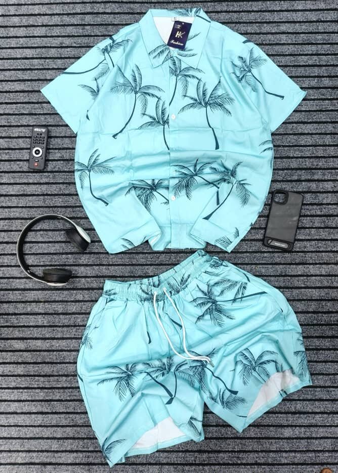 Ensemble chemise et short pour homme, style tropical, confortable et décontracté. Idéal pour les vacances.