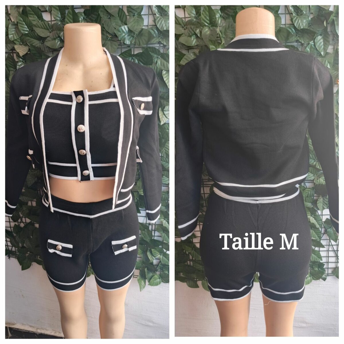 Ensemble deux pièces noir pour femmes, élégamment stylé avec des boutons décoratifs et une finition contrastante blanche. Parfait pour des occasions décontractées ou formelles. Taille M, un choix incontournable pour une garde-robe moderne et sophistiquée.