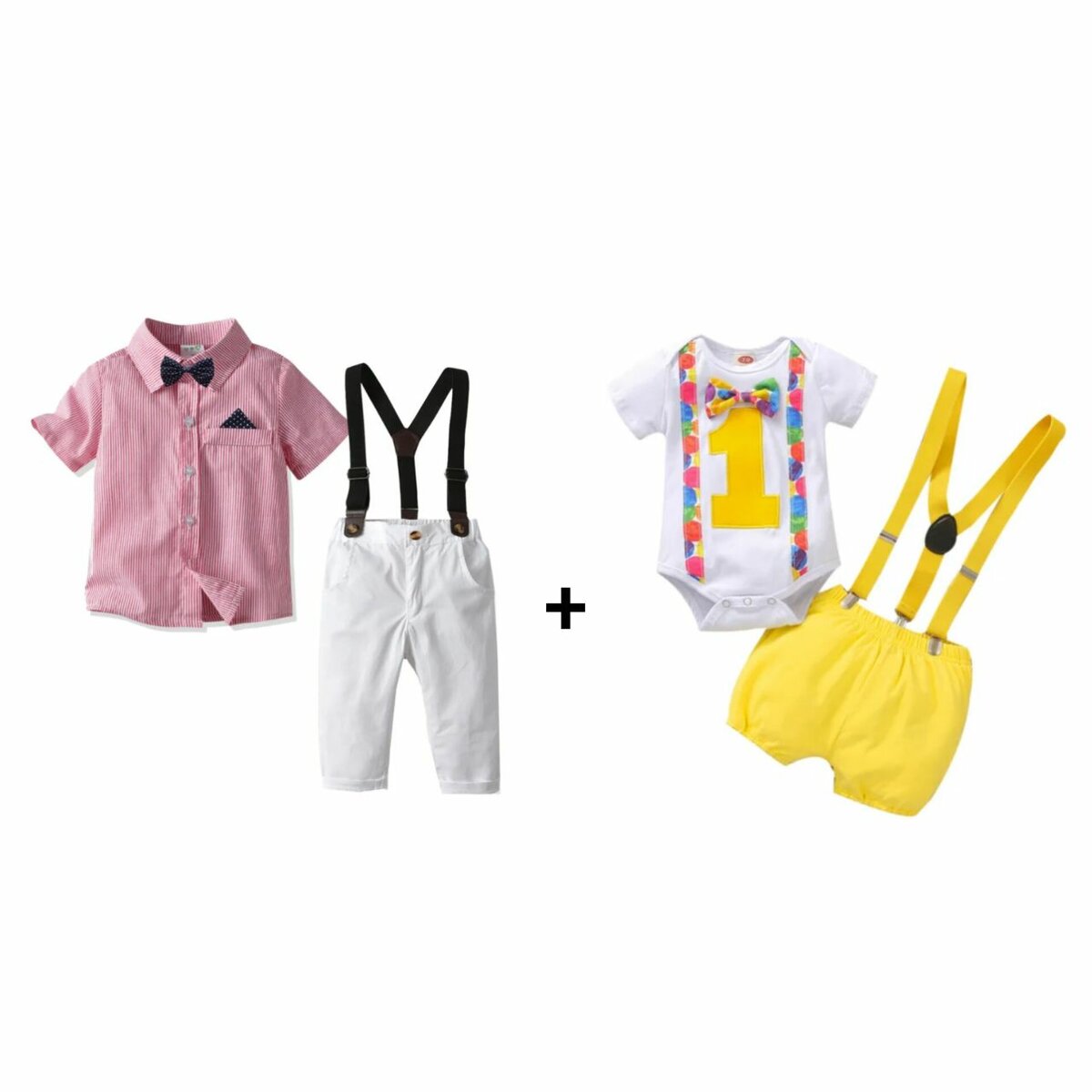 Adorable ensemble pour garçons d'un an comprenant une chemise rayée rose avec nœud papillon, et un ensemble jaune avec bretelles. Idéal pour les anniversaires et fêtes!