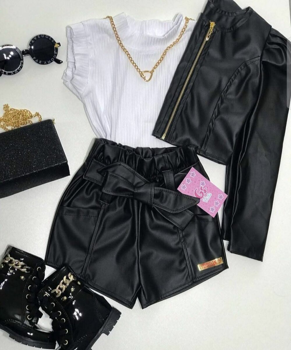 Ce superbe ensemble pour femme comprend un haut blanc élégant, des shorts noirs avec une ceinture à nœud, et une veste en cuir. Parfait pour une sortie en soirée ou un événement spécial, il allie confort et style. Complété par des accessoires assortis, c'est le choix parfait pour un look tendance et affirmé.