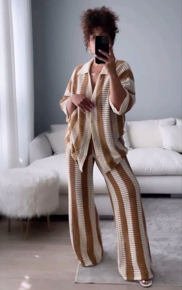 Optez pour cet ensemble élégant rayé marron et blanc, parfait pour un look estival décontracté. Confectionné dans un tissu léger et respirant, il assure confort et style. Idéal pour une journée ensoleillée ou un brunch entre amis. Associez-le avec des accessoires colorés pour un style unique et tendance.