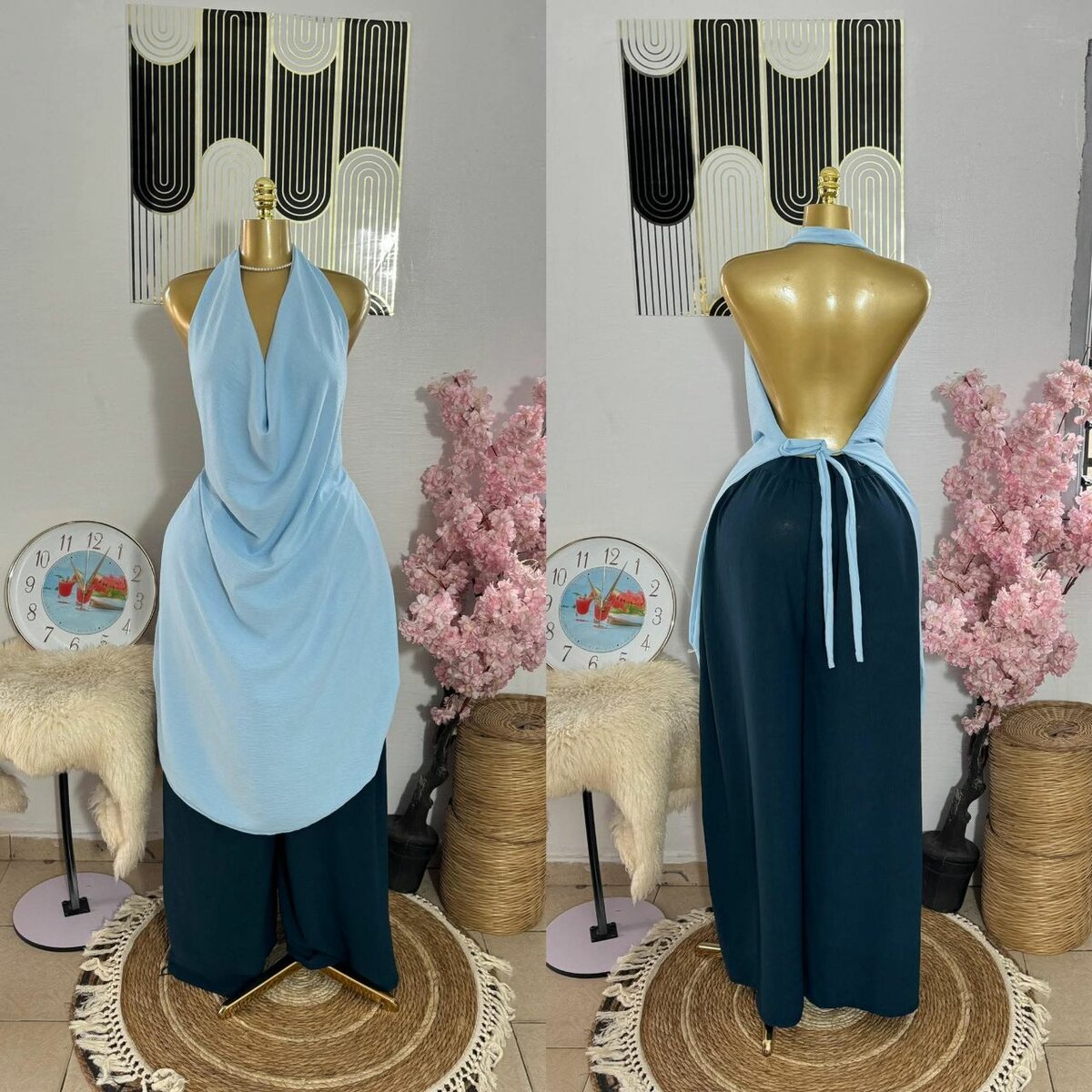Adoptez un style élégant avec cet ensemble sans manches. Comprenant un haut drapé et un pantalon fluide, il est idéal pour les soirées d'été. Matière confortable et design séduisant, parfait pour un look sophistiqué.