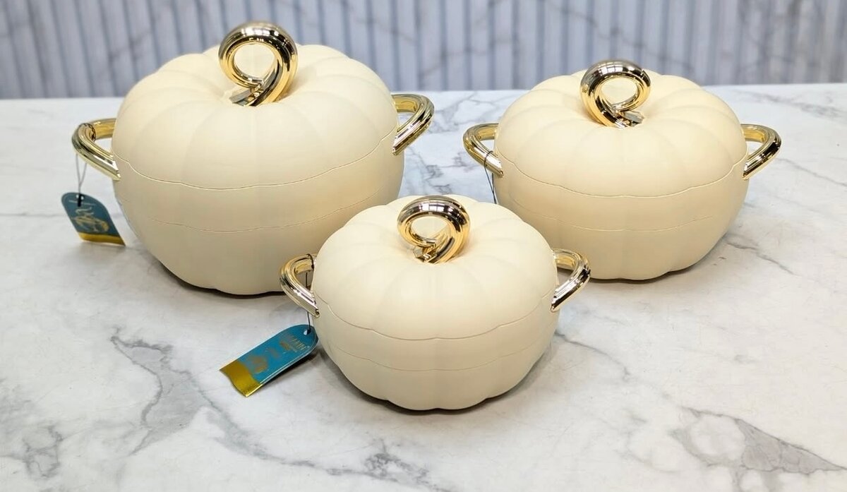 Transformez votre cuisine avec cet ensemble unique de cocottes en forme de citrouille. Avec une finition élégante et des poignées dorées, ces cocottes ajoutent une touche d'élégance à n'importe quelle table. Idéales pour servir des soupes, des ragoûts et bien plus, elles sont parfaites pour les réceptions et les repas quotidiens. Conçues pour conserver la chaleur, ces cocottes allient style et fonction pratique.