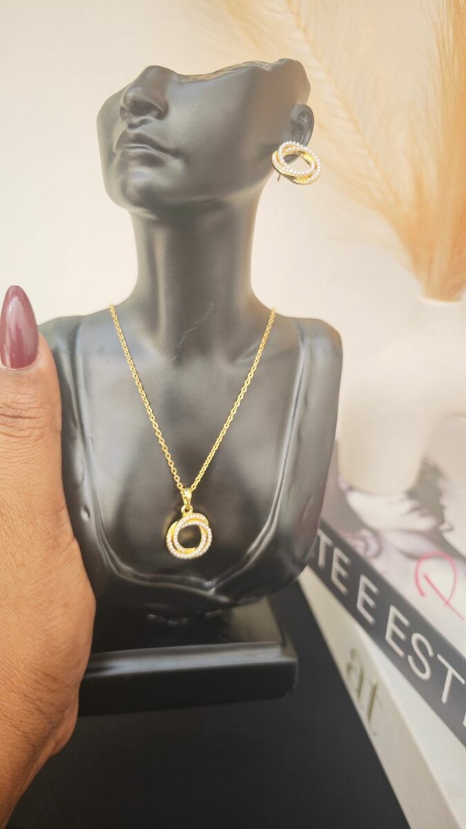Élégant ensemble de bijoux en or, comprenant un collier raffiné et des boucles d'oreilles assorties. Idéal pour sublimer vos tenues de soirée et apporter une touche de sophistication à votre style. Parfait pour offrir en cadeau ou pour compléter votre collection personnelle de bijoux.