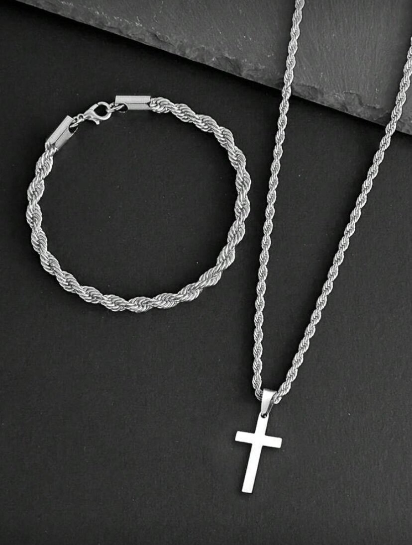 Découvrez cet élégant ensemble de collier et bracelet avec pendentif croix, fabriqué en acier inoxydable durable. Idéal pour hommes et femmes, il ajoute une touche de distinction à toute tenue. Parfait pour des occasions spéciales ou pour un usage quotidien. Exprimez votre style avec cet accessoire intemporel.