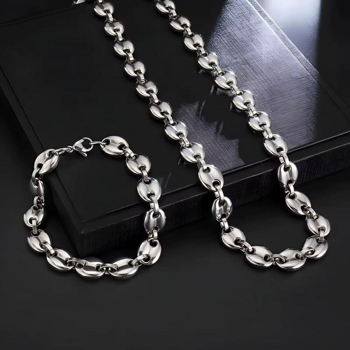 Optez pour cet élégant ensemble collier et bracelet en acier inoxydable, disponible en finitions dorée et argentée. Idéal pour sublimer vos tenues quotidiennes ou pour une occasion spéciale, cet ensemble assure longévité et style. Un choix parfait pour ceux qui aiment allier modernité et élégance.