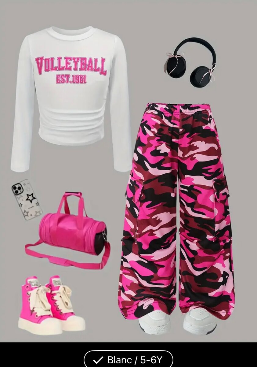 Parfait pour les enfants actifs, cet ensemble vibrant comprend un haut à manches longues 'Volleyball', un pantalon camouflage rose, des baskets stylées et des accessoires assortis pour un look complet et ludique.