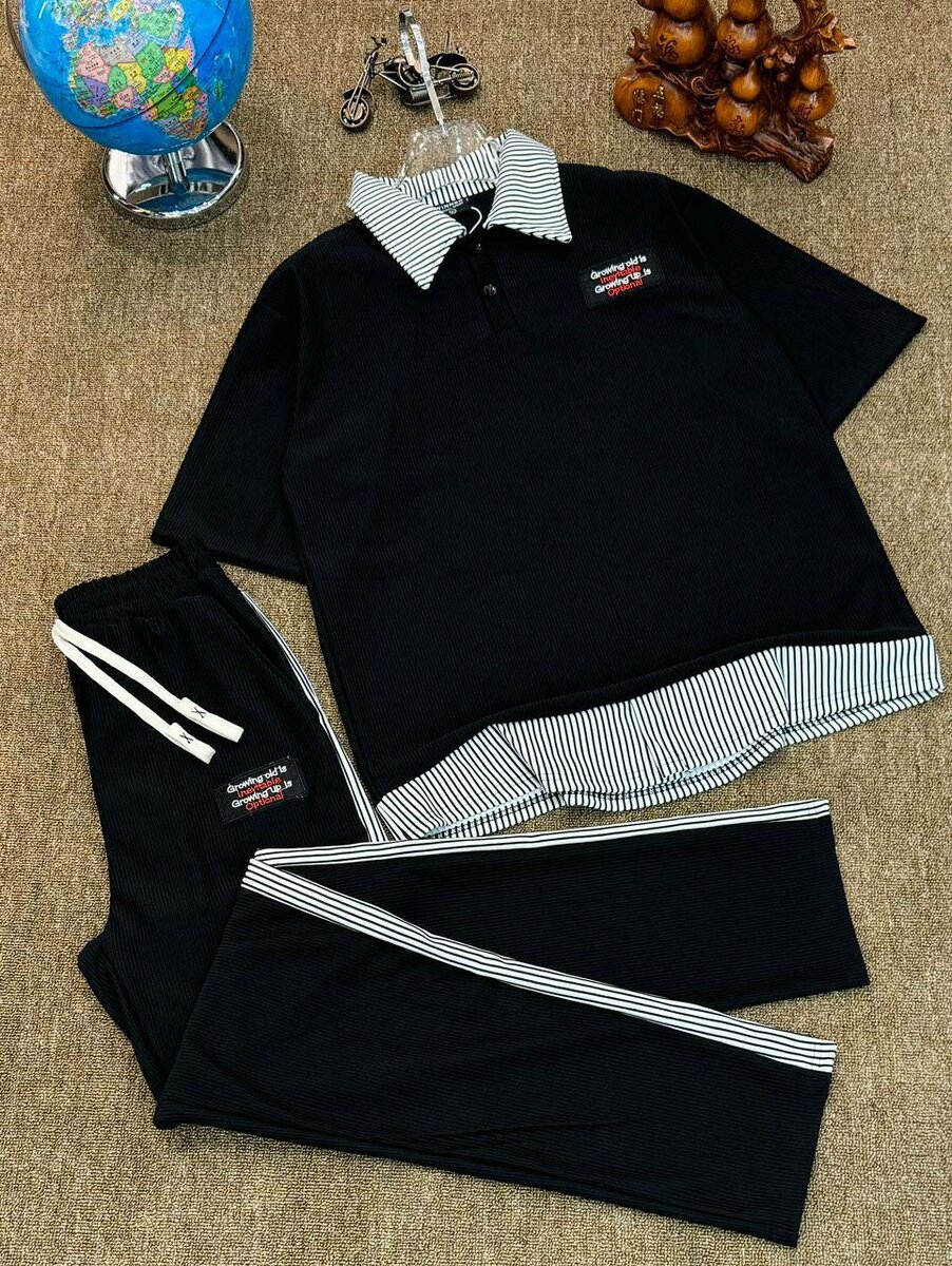 Découvrez cet ensemble noir élégant et confortable, parfait pour vos activités quotidiennes ou une journée décontractée. Il comprend un polo avec col rayé et un pantalon assorti. Idéal pour le sport ou la détente à la maison.