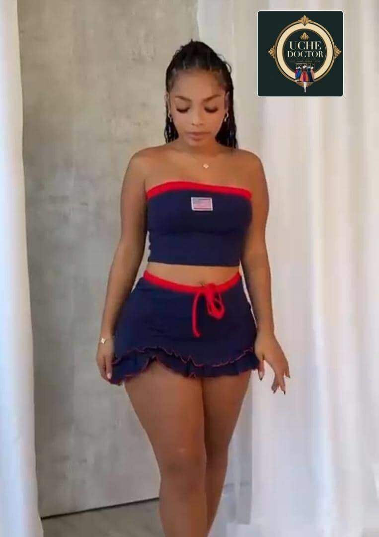 Optez pour cet ensemble court et séduisant, parfait pour l'été. Confortable et stylé, ce set bleu marine avec des accents rouges est idéal pour les sorties décontractées. Le haut bandeau et la jupe à volant offrent un look chic et féminin. Exprimez votre style unique avec cet incontournable de la garde-robe estivale.