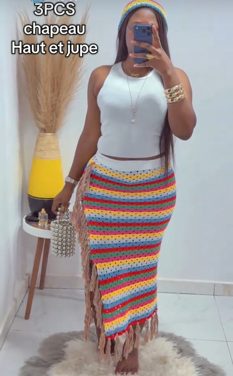 Optez pour ce magnifique ensemble crochet 3 pièces, parfait pour l'été. Comprend un chapeau, un haut et une jupe à franges colorée. Idéal pour un look bohème et chic en vacances.