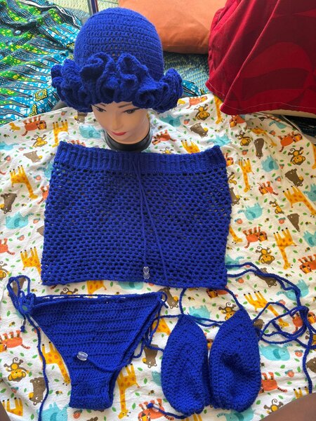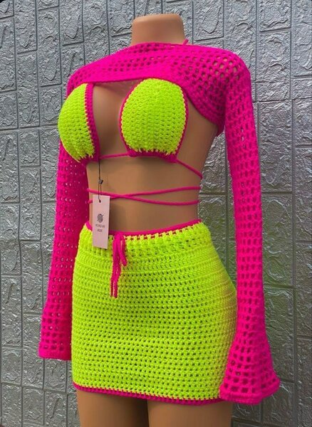 Découvrez cet ensemble de crochet vibrant, idéal pour un look bohème et coloré. Parfait pour l'été, il comprend un haut, un gilet, et un bonnet en tons chauds et vifs. Fabriqué à la main avec soin, cet ensemble unique allie confort et style, assurant une allure inoubliable. Idéal pour les festivals ou les journées ensoleillées.