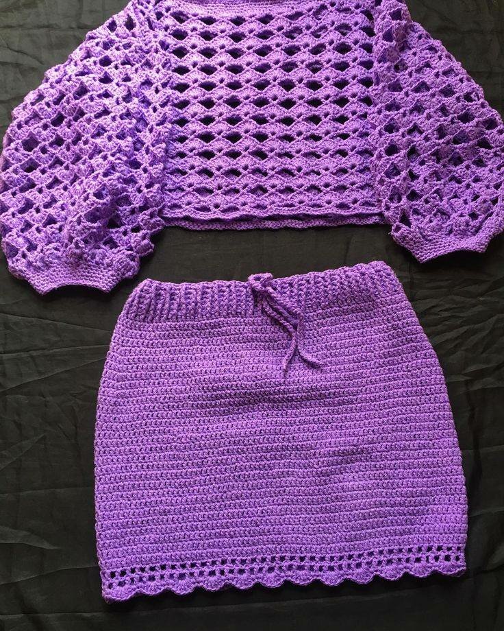 Cet ensemble crochet violet est parfait pour un look estival tendance. Conçu avec des matériaux de haute qualité, il combine style et confort. Idéal pour des sorties décontractées ou des événements spéciaux en plein air, cet ensemble mettra en valeur votre élégance naturelle.