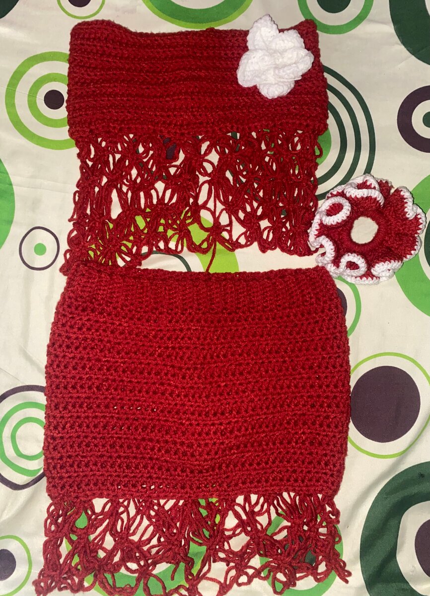 Ensemble crochet unique en orange et en rose parfait pour une tenue de plage ou une soirée estivale.