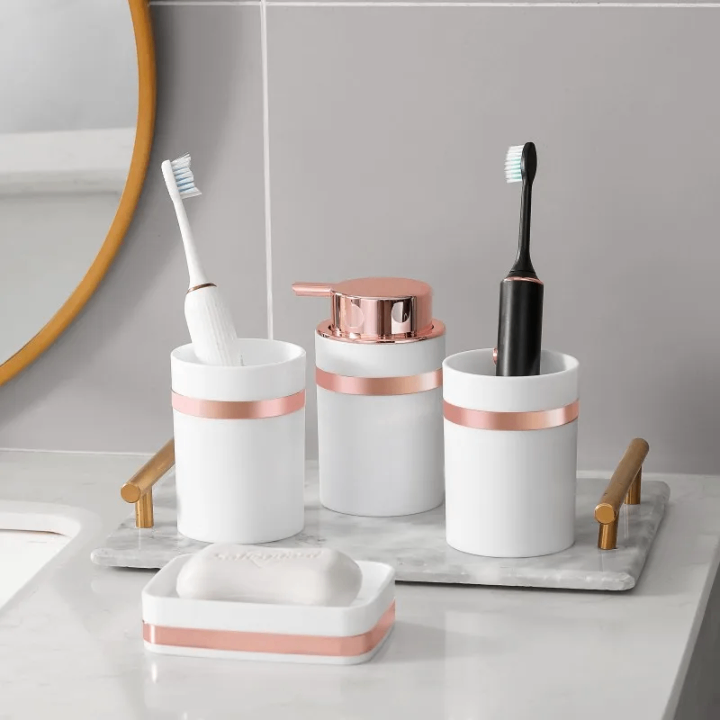 Transformez votre salle de bains avec cet ensemble moderne et chic. Comprend porte-savon, porte-brosse à dents, et distributeur de savon, tous avec des accents en métal rose doré. Parfait pour ajouter une touche d'élégance à votre quotidien.