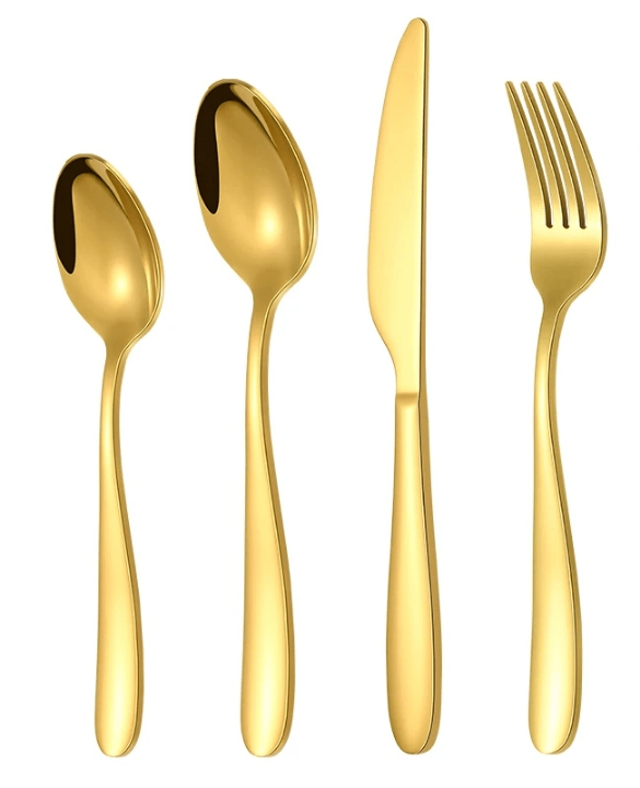 Ensemble de couverts en acier inoxydable dorés haut de gamme idéal pour la cuisine ou le service quotidien. Durable et résistant à la rouille. Un choix pratique pour tout type de repas, à la maison ou au bureau et très pratique.