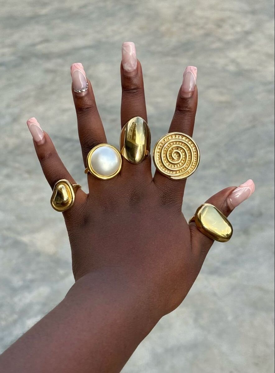 Plongez dans l'élégance avec cet ensemble de bagues dorées, idéal pour toute occasion. Chaque bague affiche un design unique, y compris des motifs géométriques et des perles opalescentes. Parfait pour ajouter une touche d'éclat à votre tenue quotidienne ou pour un événement spécial. Portez-les seules ou superposées pour un style personnalisé.