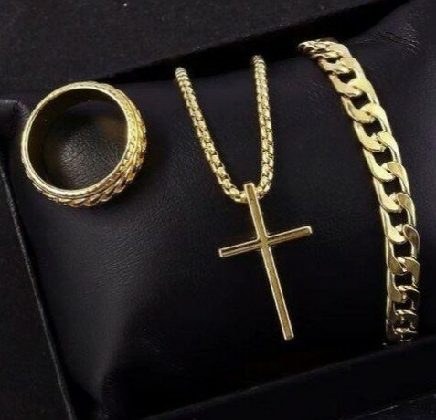 Élégant ensemble de bijoux en or comprenant une bague, un collier avec pendentif croix et un bracelet en chaîne. Idéal pour ajouter une touche sophistiquée à n'importe quelle tenue. Fabriqué avec un souci du détail exceptionnel, parfait pour offrir en cadeau ou pour se faire plaisir.