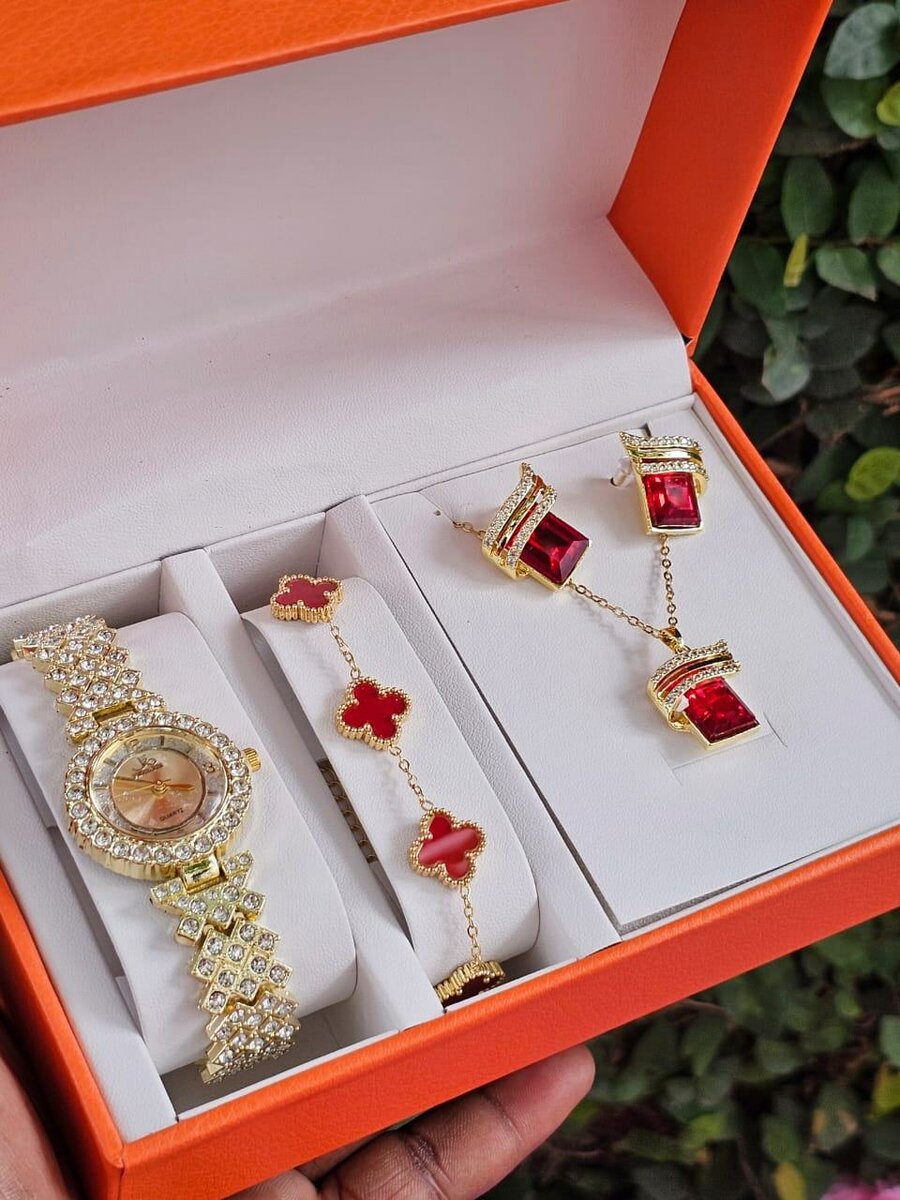 Découvrez cet ensemble de bijoux élégants, comprenant une montre, des boucles d'oreilles, un bracelet et des bagues, ornés de pierres rouges et de détails dorés. Un cadeau idéal pour les occasions spéciales.