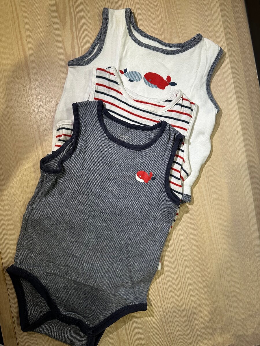 6 mois. Set de 3 bodies sans manches pour bébé, décorés de motifs de baleines et rayures. En coton doux, idéal pour la peau délicate des enfants. Parfait pour une utilisation quotidienne ou comme cadeau.