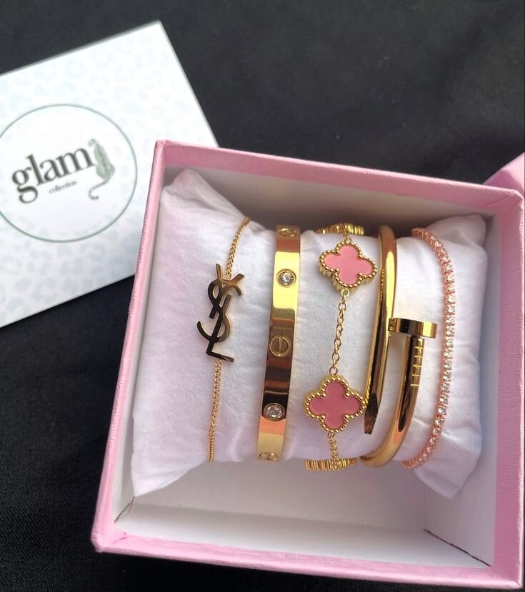Cet ensemble de bracelets en plaqué or comprend des pièces élégantes avec des breloques YSL et des coeurs roses. Conçu pour celles qui recherchent un style raffiné et tendance, ce set est idéal pour un usage quotidien ou comme cadeau luxueux.