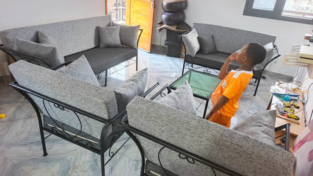 ensemble de fauteuil en fer forgé de sept places confortable résistant durable avec garantie , composé en un divan de trois places de deux fauteuils d'une place et la table basse