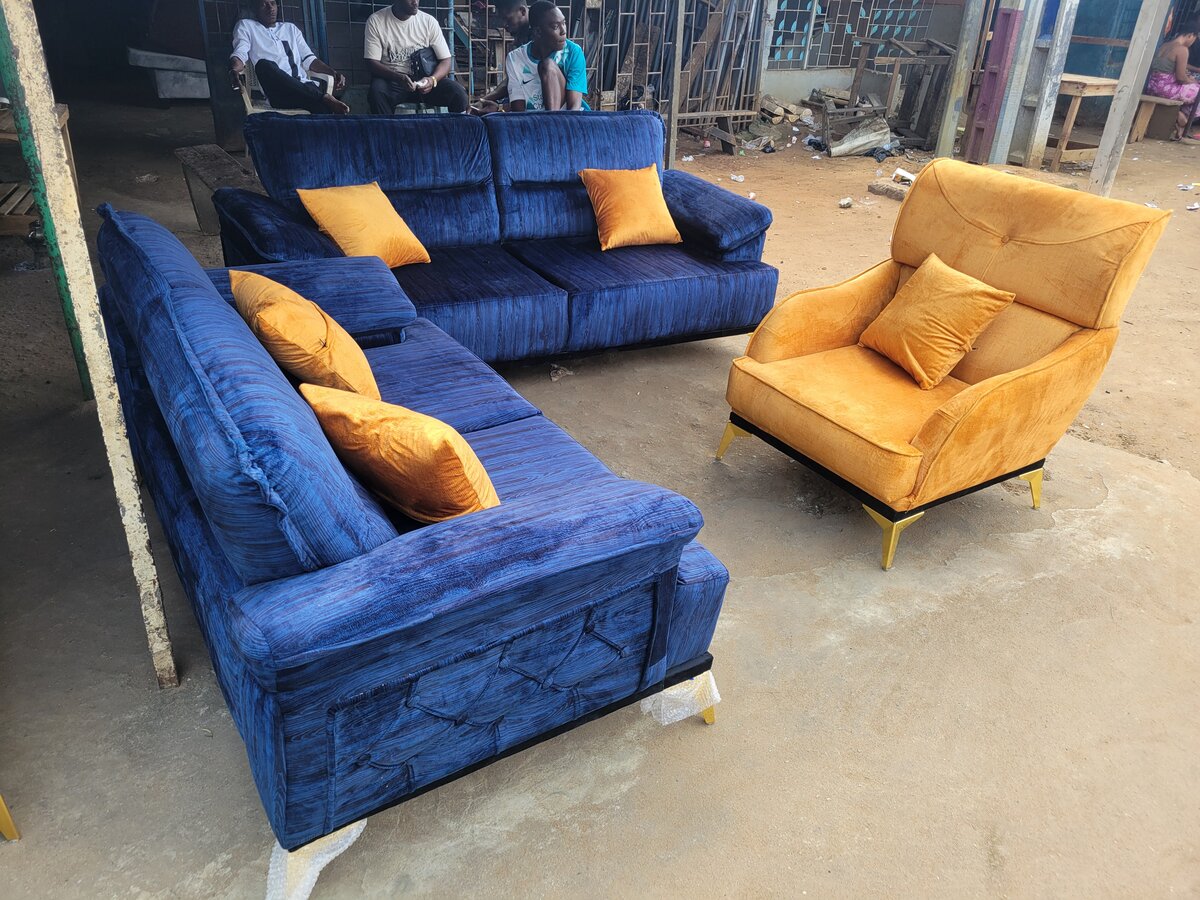 Découvrez notre ensemble de canapés en velours bleu et fauteuil orange pour une touche d'élégance. Idéal pour un salon moderne, ce mobilier offre confort et style avec son design unique et ses coussins assortis. Parfait pour recevoir vos invités dans un cadre chaleureux et sophistiqué.