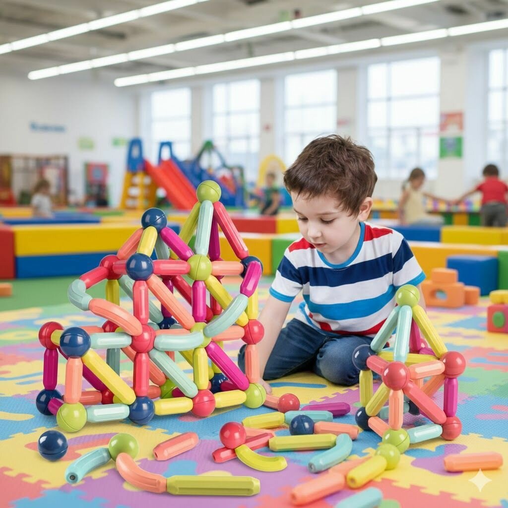 L'image montre un ensemble de construction magnétique, spécifiquement l'ensemble de 42 boules et tiges magnétiques Jofarstep.