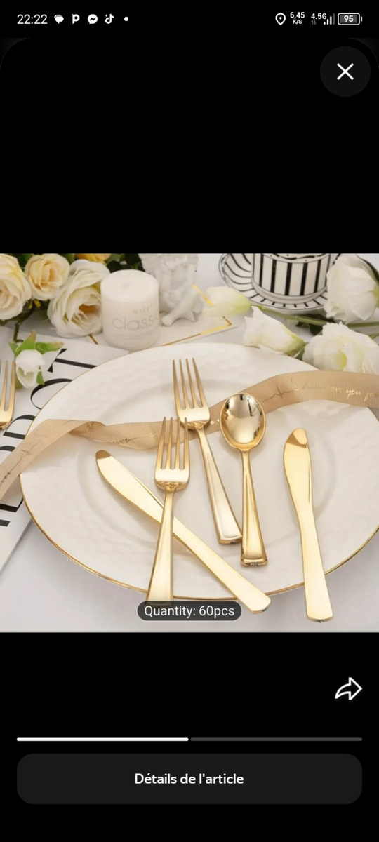 Transformez votre table avec cet ensemble de couverts dorés de 60 pièces, parfait pour des dîners élégants. Fabriqué en acier inoxydable de haute qualité, il allie style et durabilité. Idéal pour des occasions spéciales ou un usage quotidien, ajoutez une touche de luxe à chaque repas. Parfait pour les familles ou les événements.