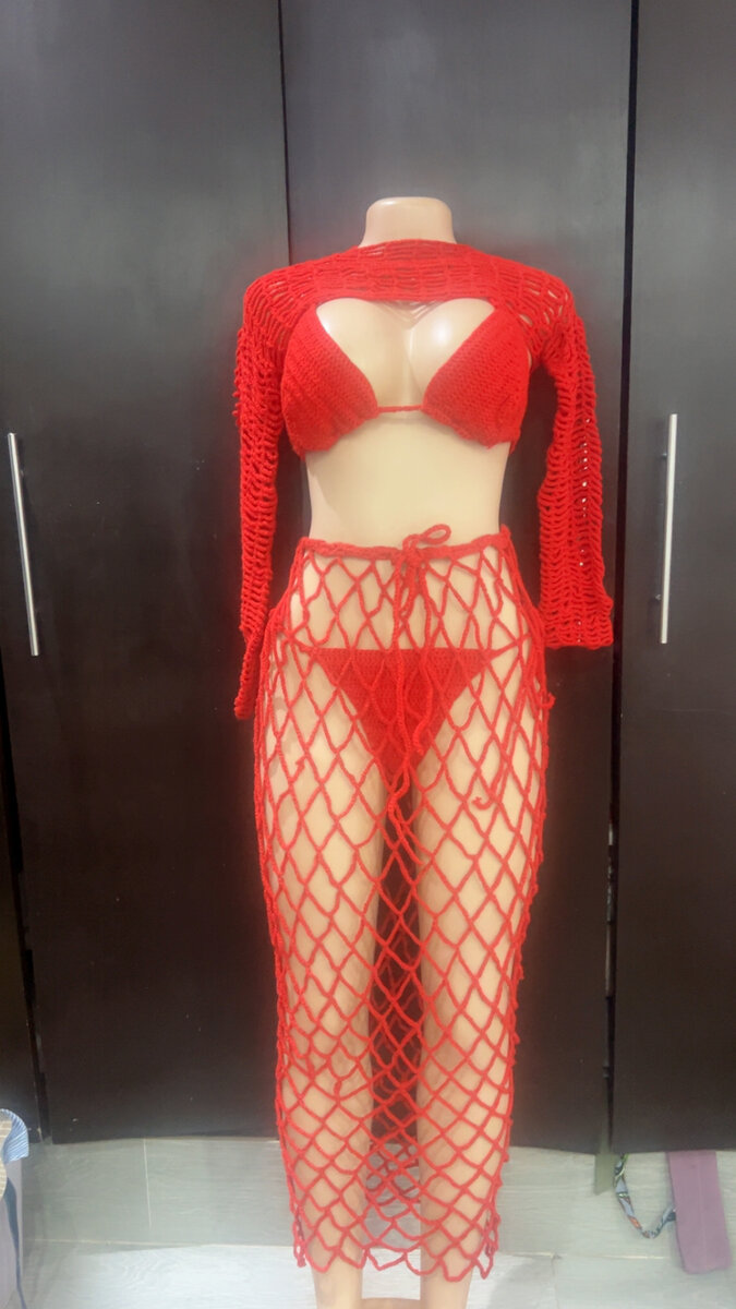 Embellissez votre été avec cet ensemble de plage crochet rouge vibrant et séduisant. Comprenant un haut bikini et une jupe filet, c'est la tenue idéale pour flâner au bord de la piscine ou profiter d'une journée à la plage. Conçu pour les femmes audacieuses, il offre un style unique et un confort inégalé grâce à son crochet extensible. Idéal pour ajouter une touche chic à vos vacances.