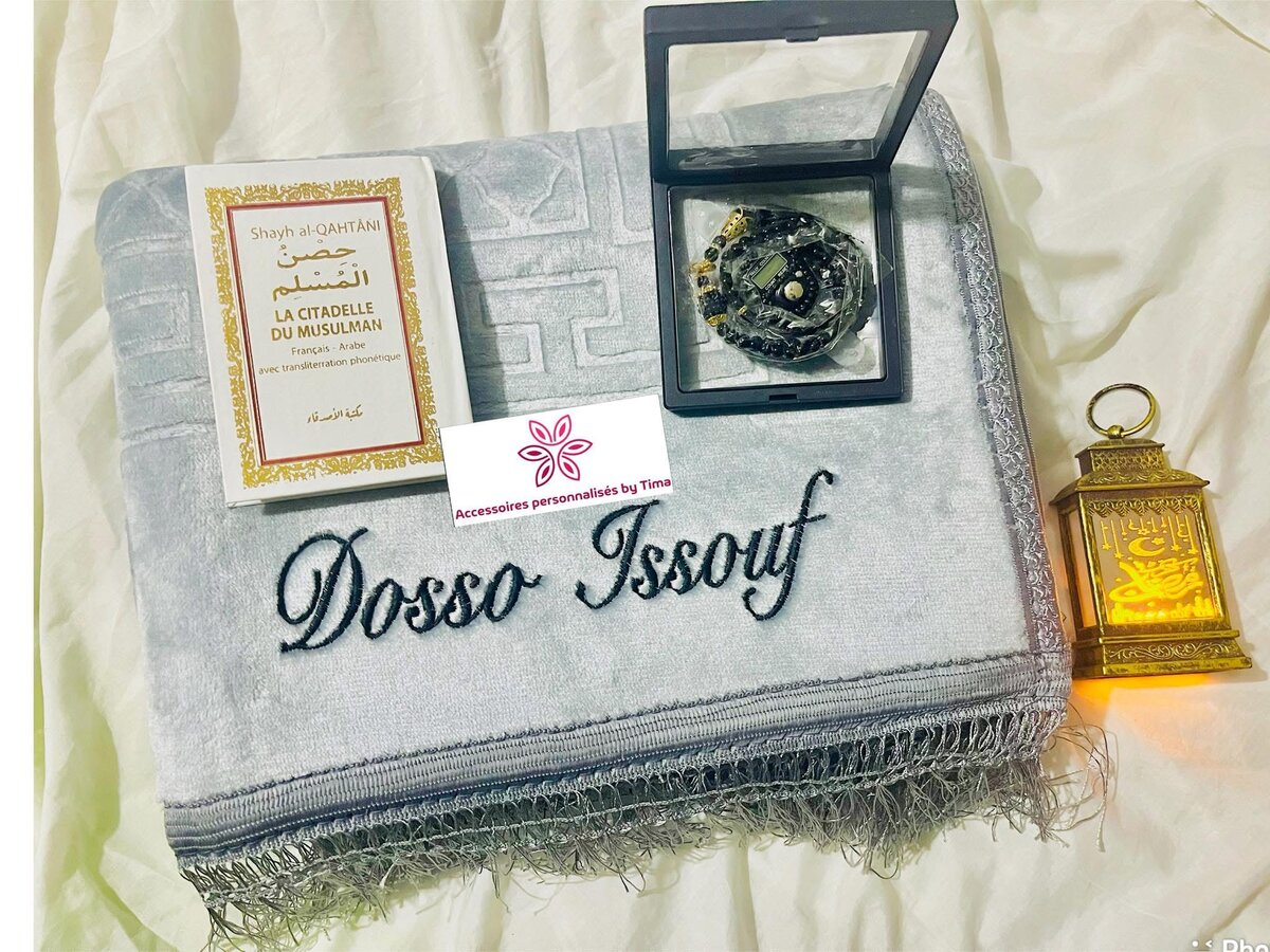 Découvrez cet ensemble de prière complet comprenant un tapis avec broderie personnalisée, un livre de prières inspirant, un magnifique chapelet et une lanterne décorative en laiton. Parfait pour des moments spirituels paisibles à la maison ou en voyage.