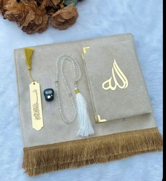 Ensemble de prière chic avec Coran doré, chapelet et marque-page décoratif. Parfait pour vos moments spirituels. Idéal pour offrir.