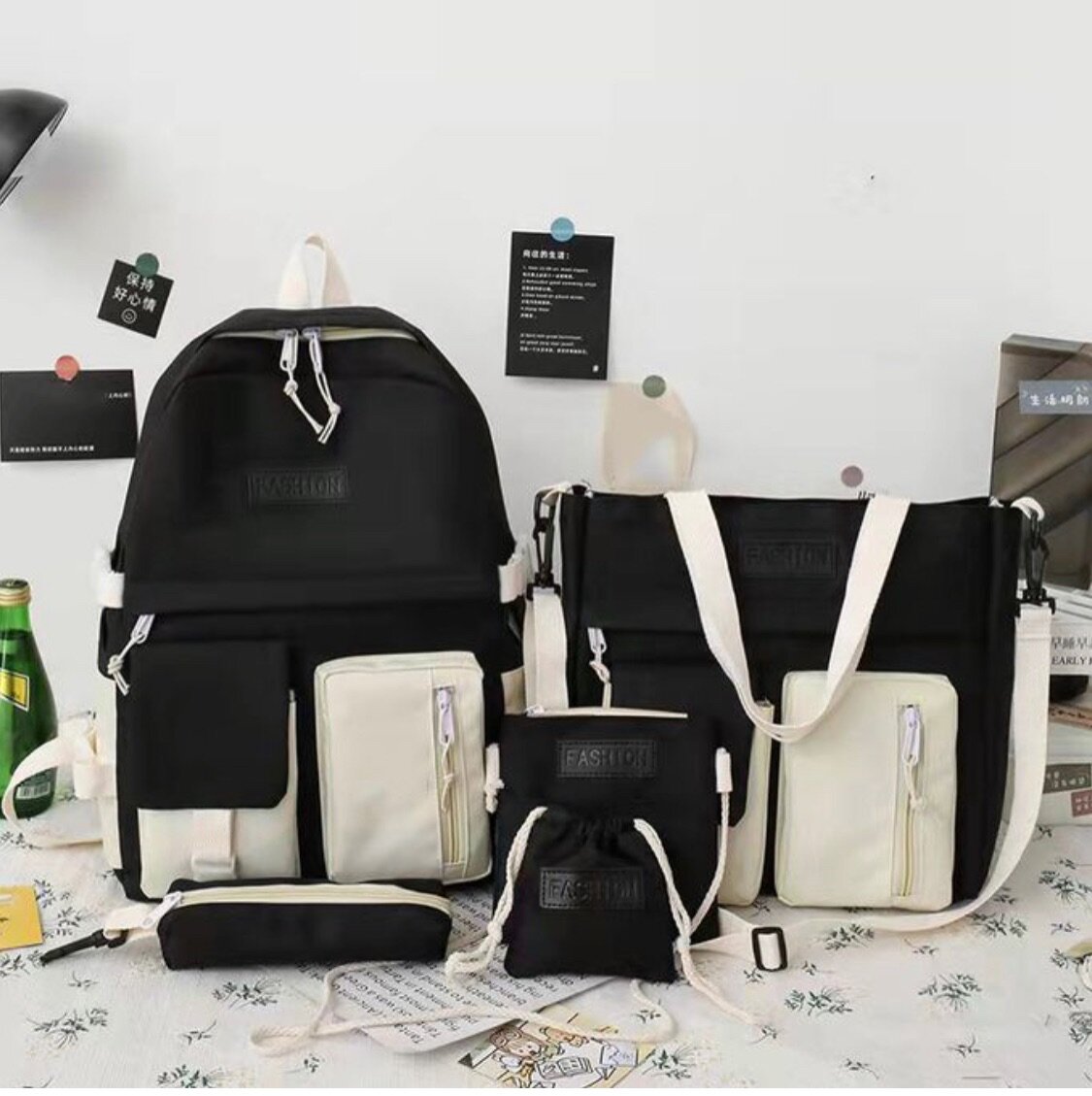 Ensemble élégant et fonctionnel de sacs noirs et blancs, idéal pour l'école ou le voyage. Comprend un sac à dos spacieux, un sac à bandoulière pratique, une trousse et un sac à cordon. Conçu pour une organisation optimale et un style moderne. Parfait pour les étudiants ou les voyageurs.