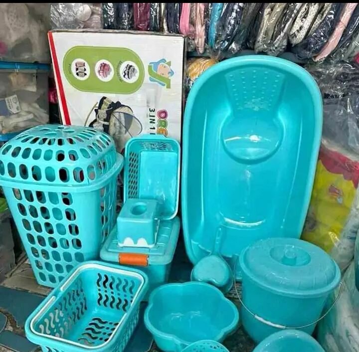 Ensemble de salle de bain pratique et compact pour bébé. Comprend une baignoire, un bac à linge et divers accessoires. Léger et facile à transporter. Idéal pour les voyages ou les besoins à la maison.
