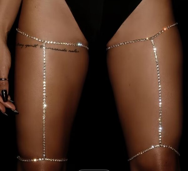 Ensemble de sous-vêtements en rhinestones dorés pour femme. Cet ensemble comprend un soutien-gorge et un string orné de motifs élégants en rhinestones. Parfait pour les occasions spéciales ou pour ajouter une touche de glamour à votre lingerie quotidienne.