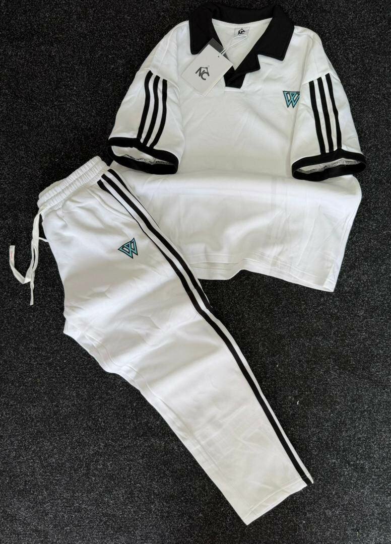 Découvrez cet ensemble de sport blanc, idéal pour vos séances d'entraînement ou vos sorties décontractées. Confortable et stylé, il se compose d'un t-shirt à manches courtes et d'un pantalon avec bandeaux noirs distinctifs. Parfait pour une allure sportive et tendance.