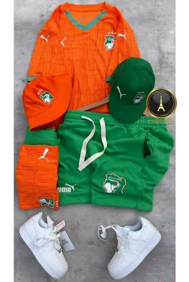Supportez votre équipe favorite avec cet ensemble de sport aux couleurs vibrantes de la Côte d'Ivoire. Comprend un maillot, un short, deux casquettes assorties et des chaussettes. Parfait pour les jours de match ou un look décontracté unique. Matériaux durables et confortables. Un must pour chaque fan !