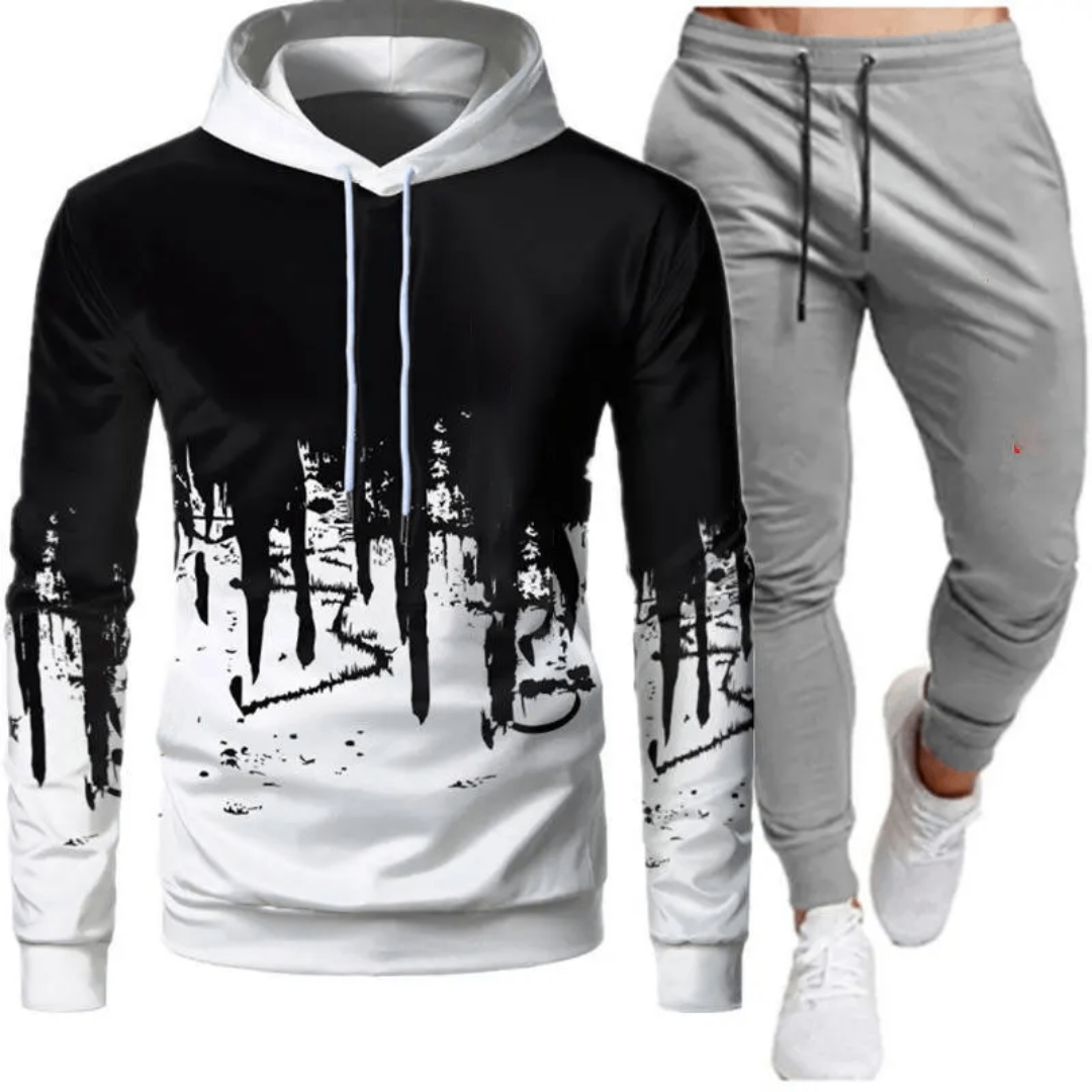 Ensemble tendance de survêtement pour homme avec un sweat à capuche noir et blanc et un pantalon gris. Idéal pour le sport et le quotidien avec un style urbain unique. Confortable et stylé, parfait pour un look moderne et dynamique.