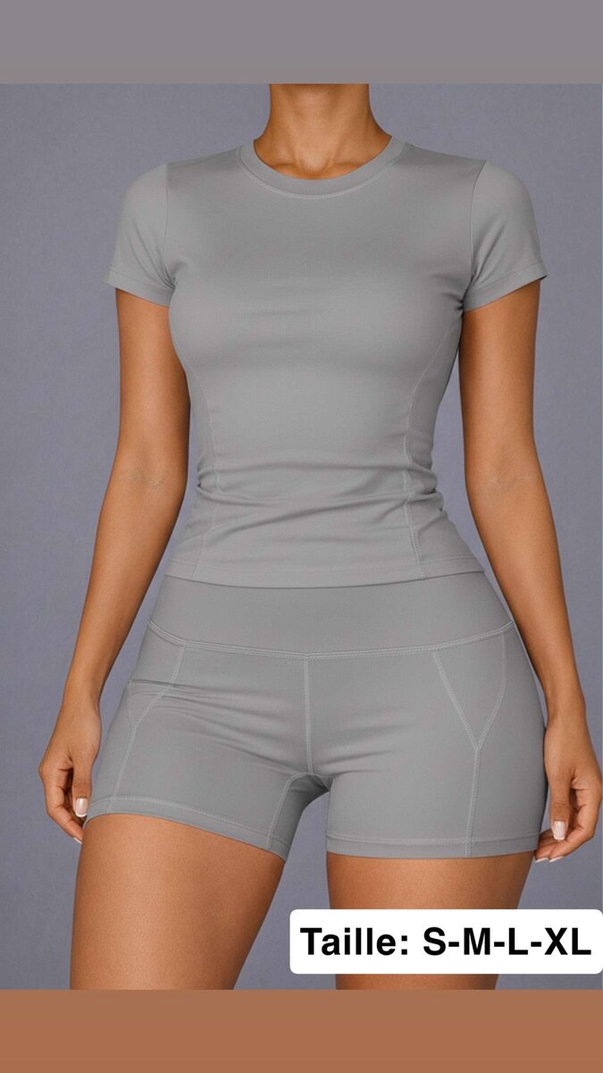Optez pour cet ensemble de sport gris, idéal pour vos séances d'entraînement. Confortable et flexible, disponible en tailles S à XL. Parfait pour le fitness et le yoga.
