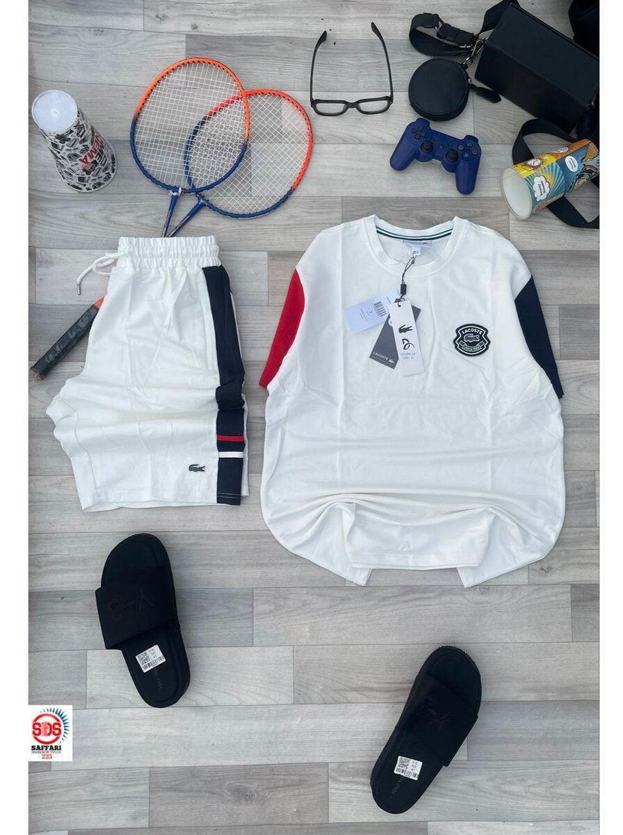 Ensemble de sport élégant pour homme, composé d'un t-shirt et d'un short blanc avec détails contrastés. Idéal pour le tennis ou le fitness, ce vêtement offre confort et style. Parfait pour les séances d'entraînement en salle ou en extérieur. Une tenue incontournable pour les amateurs de sport.