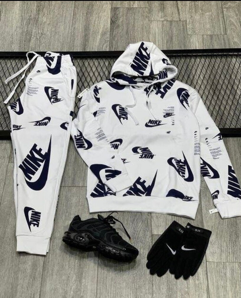 Optez pour le confort et le style avec cet ensemble de sport Nike. Parfait pour les entraînements ou une tenue décontractée, cet ensemble comprend un sweat à capuche et un pantalon imprimés, associés à des sneakers noires élégantes. Idéal pour ceux qui aiment mêler mode et fonctionnalité lors de leurs activités quotidiennes.