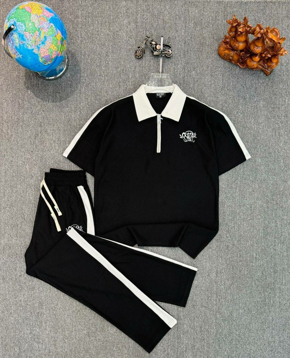 Un ensemble de sport chic et confortable, idéal pour le quotidien. Fabriqué en matériaux doux, ce set se compose d'un polo à manches courtes avec un col contrastant et d'un pantalon assorti. Parfait pour les activités décontractées ou sportives.