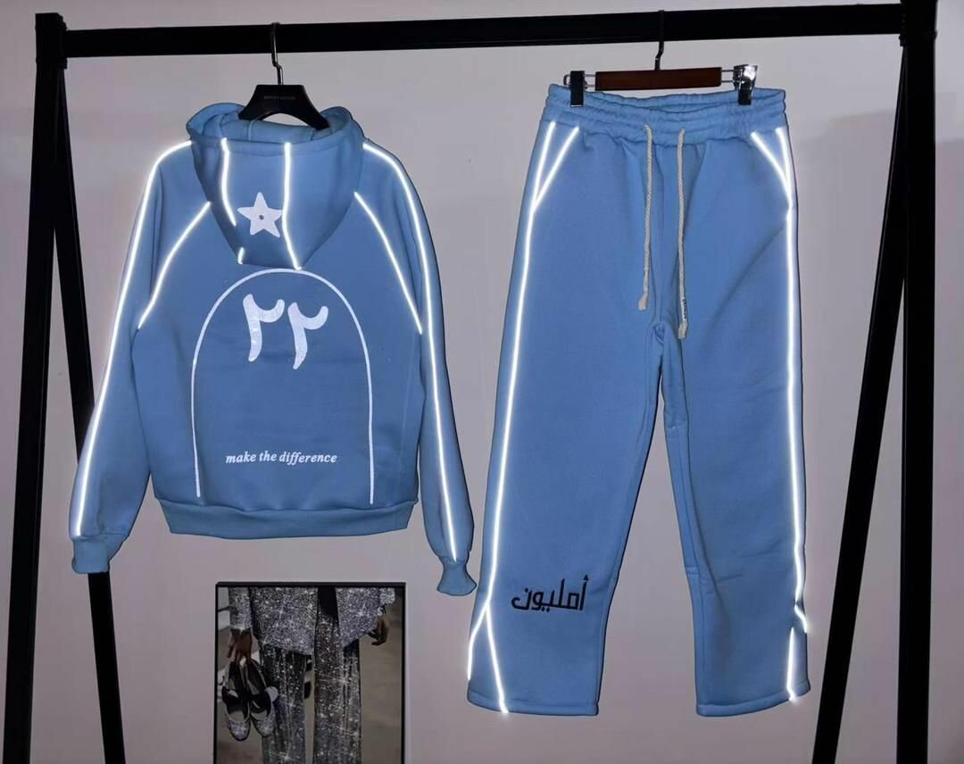 Cet ensemble de sport élégant et confortable se compose d'un sweat à capuche et d'un pantalon à bandes réfléchissantes. Parfait pour les activités en plein air ou une séance de sport, il assure visibilité et style. Choisissez-le pour vos entraînements matinaux ou pour un look décontracté.