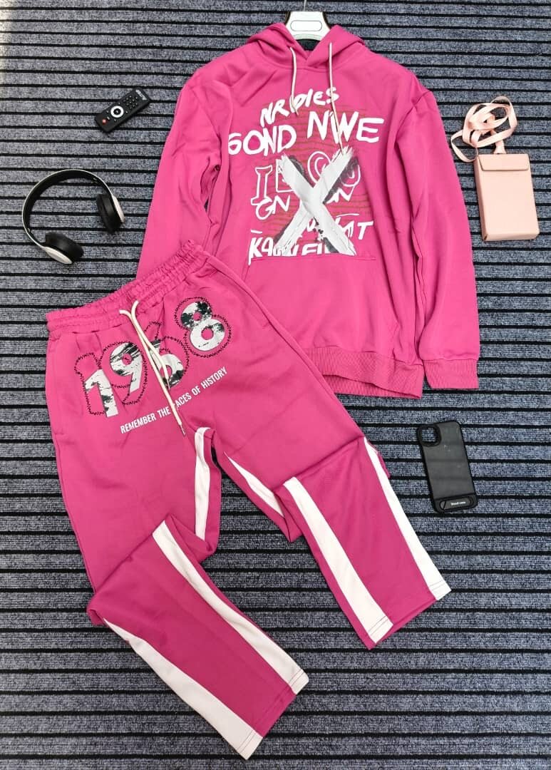 Découvrez ce superbe ensemble de sport rose, parfait pour le confort et le style. Idéal pour une tenue décontractée ou pour vos séances de sport. Conçu en matière douce et respirante pour un maximum de confort. L'année 1988 inscrite sur le pantalon ajoute une touche vintage unique. Parfait pour les amateurs de mode audacieuse.