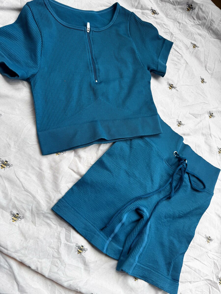 Rafraîchissez votre garde-robe avec cet ensemble de sport élégant pour femme. Comprenant un haut ajusté à fermeture éclair et un short confortable, disponible en bleu vif et blanc classique. Parfait pour les séances de gym ou un look décontracté.