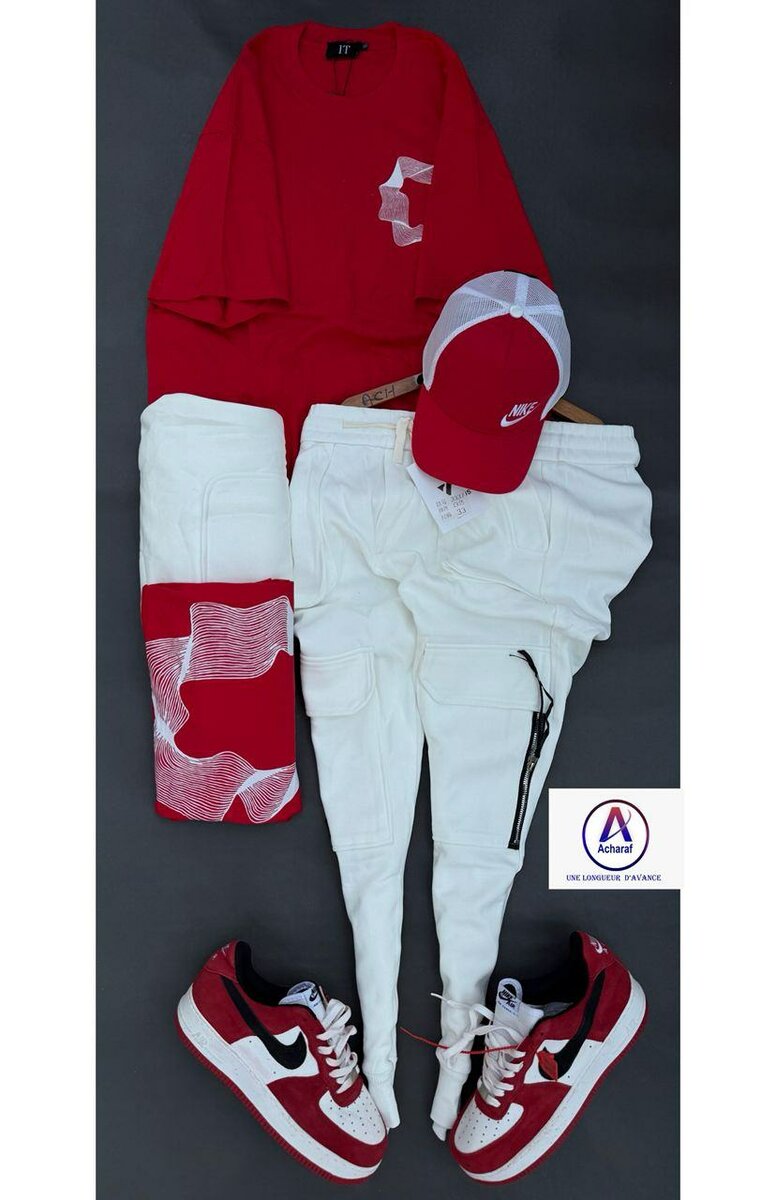 Optez pour un look sportif et stylé avec cet ensemble rouge et blanc. Comprend un t-shirt confortable, un pantalon polyvalent avec poches, et des baskets assorties pour un look coordonné. Idéal pour les activités décontractées ou sportives. Fabriqué avec des matériaux de qualité pour un confort maximal. Parfait pour les amateurs de mode sportive.
